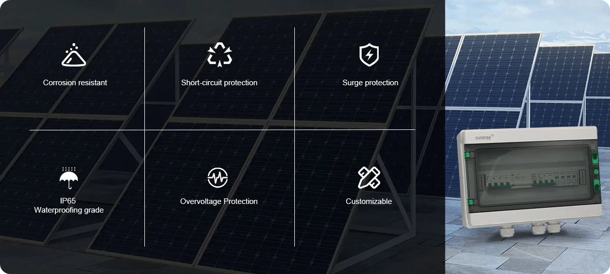 Utilisé pour la sortie CA d'onduleurs de 1 à 50 kW. La cote de courant du fusible photovoltaïque et du disjoncteur est modifiée.