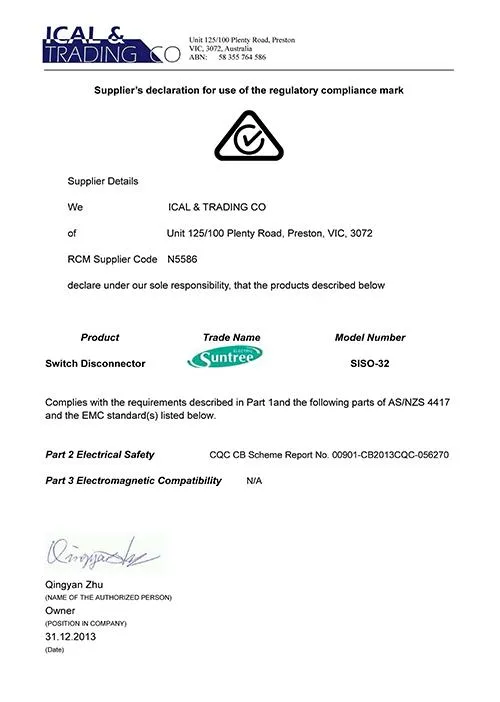 L'interrupteur isolateur CC produit par Zhejiang Xinchi Electric Co., Ltd. a passé la certification RCM en Australie, en utilisant la toute dernière technologie de trempe, étanche et antipoussière pour améliorer les performances du produit.
